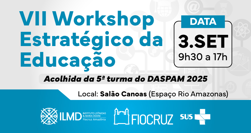O Instituto Leônidas & Maria Deane (ILMD/Fiocruz Amazônia) por meio de sua Vice-Diretoria de Educação, Informação e Comunicação (VDEIC), realiza na próxima quarta-feira, 3/9, a partir de 9h30, no Salão Canoas, auditório da Instituição, o VII Workshop Estratégico da Educação. Em sua 7ª edição, o tradicional evento de acolhida aos discentes, irá receber a 5ª turma do curso de Doutorado Acadêmico em Saúde Pública na Amazônia (DASPAM), ofertado em associação com a Universidade Federal do Amazonas (UFAM) e Universidade do Estado do Amazonas (UEA).