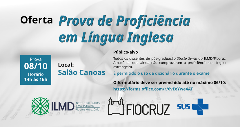 O Instituto Leônidas e Maria Deane (ILMD/Fiocruz Amazônia) informa que estão abertas, até o próximo dia 6/10, as inscrições para a Prova de Proficiência em Língua Inglesa, que será ofertada este ano pela Vice-Diretoria de Educação, Informação e Comunicação (VDEIC) para todos os discentes de pós-graduação Stricto Sensu, do ILMD Fiocruz/ Amazônia, que ainda não comprovaram a proficiência em língua estrangeira. A prova acontecerá no dia 8/10, das 14h às 16h, no Salão Canoas, prédio Rio Amazonas. As inscrições devem ser feitas obrigatoriamente através do link https://forms.office.com/r/6vEeYwe4AT. Será permitido o uso de dicionário durante o exame.