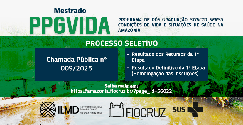 O Instituto Leônidas & Maria Deane (ILMD/Fiocruz Amazônia), divulgou o resultado dos recursos da 1ª etapa e resultado definitivo da homologação das inscrições, para o processo de seleção pública de candidatos, para ingresso no Curso de Mestrado Acadêmico do Programa de Pós -Graduação Stricto Sensu em Condições de Vida e Situações de Saúde na Amazônia (PPGVIDA), turma 2026.