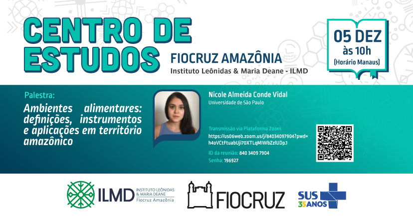 O Centro de Estudos do Instituto Leônidas e Maria Deane (ILMD/Fiocruz Amazônia) promove nesta sexta-feira, 5/12, a partir das 10h, a palestra “Ambientes alimentares: definições, instrumentos e aplicações em território amazônico”, a ser ministrada pela nutricionista Nicole Almeida Conde Vidal, pesquisadora da Universidade de São Paulo, especialista na área de saúde pública, epidemiologia e ambiente alimentar construído e natural, com uso de técnicas de análise espacial.