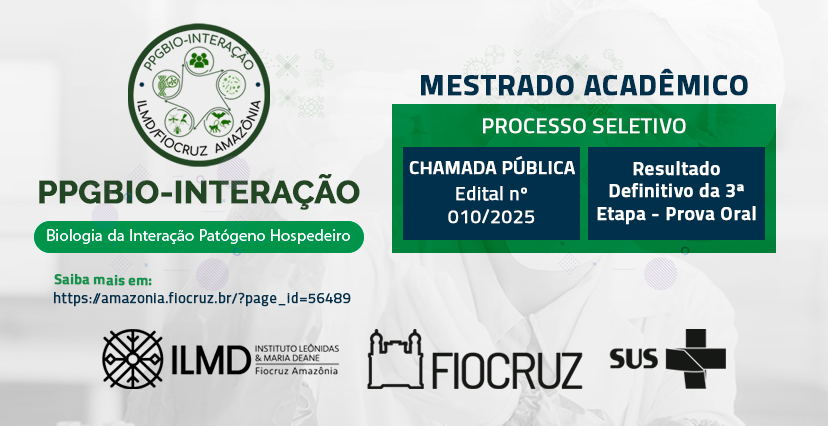O Instituto Leônidas & Maria Deane (ILMD/Fiocruz Amazônia) divulgou o resultado definitivo da prova oral (3ª Etapa), do processo de seleção pública de candidatos para ingresso no Curso de Mestrado Acadêmico do Programa de Pós-Graduação Stricto Sensu em Biologia da Interação Patógeno Hospedeiro (PPGBIO-Interação), referente à Chamada Pública nº 010/2025.