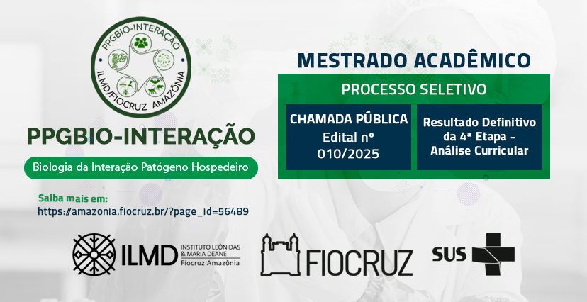 O Instituto Leônidas e Maria Deane (ILMD/Fiocruz Amazônia) divulgou nesta quarta-feira, 17/12, o Resultado Definitivo da 4ª Etapa referente à análise do Currículo Lattes do Processo Seletivo ao curso de Mestrado Acadêmico do Programa de Pós-Graduação em Biologia da Interação Patógeno-Hospedeiro (PPGBIO-Interação), objeto da Chamada Pública nº 010/2025.