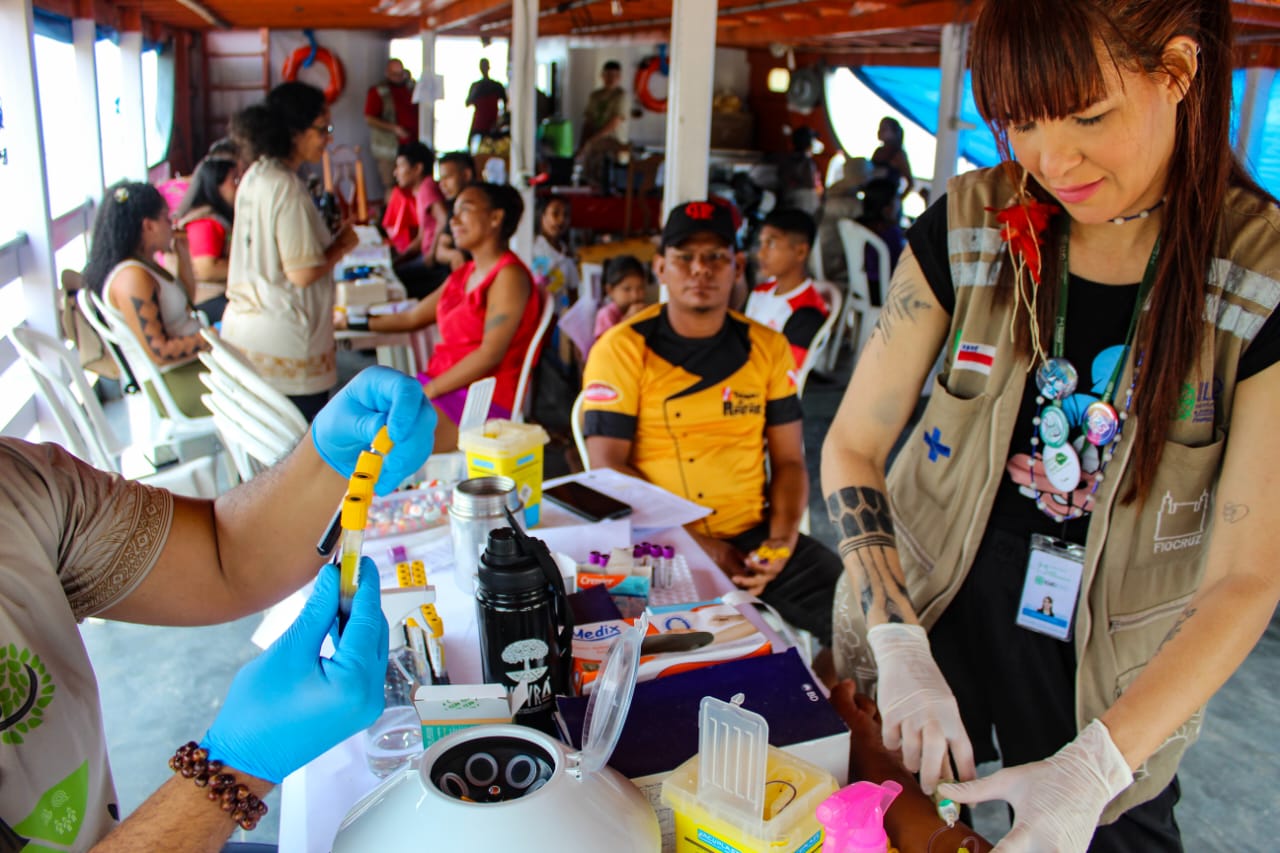 A expedição, que retorna a Manaus no dia 22/02, ocorre em uma embarcação adaptada que desce o Rio Cunamã e visita aldeias mais distantes. Os indígenas adentram o barco, passam por um circuito previamente pensado para aplicação de questionários, realização de triagem e por fim coleta de amostras de sangue. “Assim, fazemos uma pesquisa interativa e realizamos oficinas temáticas, grupos focais com lideranças e educação em saúde, interagindo com as comunidades em seu ambiente natural”, comenta Tobias, desatacando o ineditismo do roteiro de coleta de dados de forma embarcada e com diversos grupos de pesquisa convivendo no mesmo ambiente.