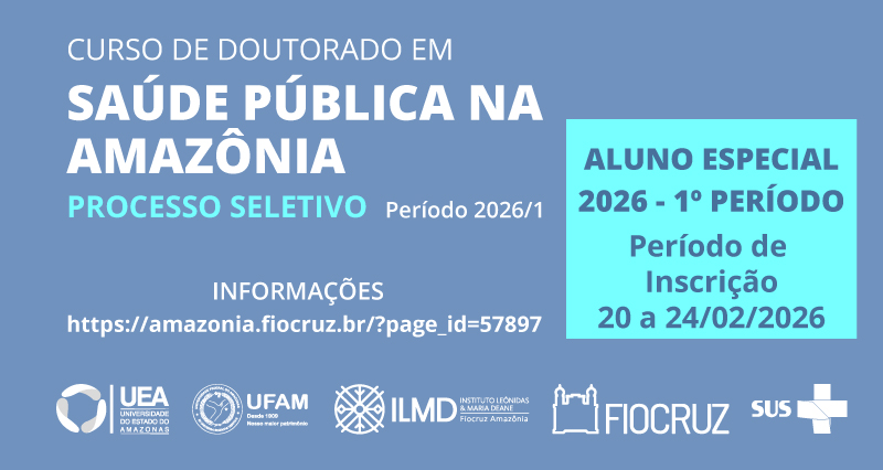 O Doutorado em Saúde Pública na Amazônia – DASPAM, programa em associação com o Instituto Leônidas & Maria Deane-ILMD-Fiocruz Amazônia, a Universidade Federal do Amazonas – UFAM e a Universidade Estadual do Amazonas – UEA, através da Vice-Diretoria de Educação, Informação e Comunicação, do ILMD/Fiocruz Amazônia, está com inscrições abertas para candidatos externos interessados nas disciplinas oferecidas para o 1º semestre de 2026. As inscrições ocorrerão no período de 20 a 24 de fevereiro de 2026.