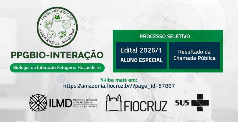 O Programa de Pós-Graduação Stricto Sensu em Biologia da Interação Patógeno Hospedeiro (PPGBIO Interação), do Instituto Leônidas & Maria Deane, através da Vice-Diretoria de Educação, Informação e Comunicação, divulgou o resultado do processo seletivo de candidatos externos, interessados nas disciplinas oferecidas para o 1º semestre de 2026.