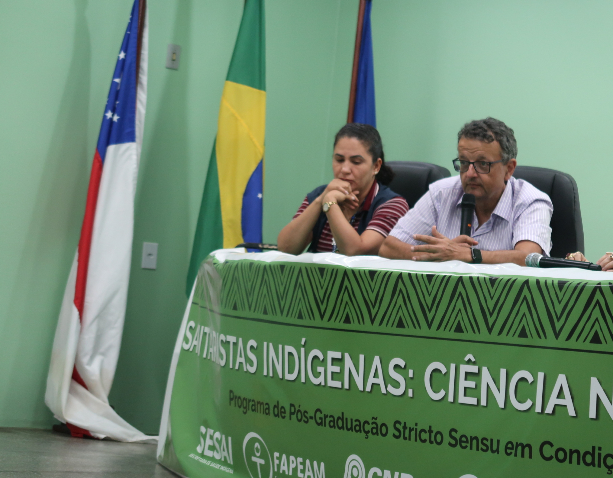 O evento contou com a presença da vice-presidente adjunta de Educação, Informação e Comunicação (VPEIC/Fiocruz), Eduarda Ângela Pessoa Cesse, da diretora da Fiocruz Amazônia, Stefanie Costa Pinto Lopes, do diretor do Centro de Estudos Superiores de Tabatinga da UEA, Edilson de Carvalho Filho, do vice-diretor de Educação, Informação e Comunicação da Fiocruz Amazônia, Cláudio de Oliveira Peixoto, da coordenadora do PPGVIDA, Ani Beatriz Jackisch Matsuura, e do apoiador de saúde Nilson Alexandre, da Coordenação do Distrito Sanitário Especial Indígena (DSEI Alto Solimões). Participaram da Mesa “Vozes Indígenas em Diálogo com os Formadores em Saúde Coletiva” Luiza Garnelo, o médico e coordenador da área de Saúde Coletiva na CAPES Bernardo Lessa Horta, pesquisador visitante sênior do ILMD/Fiocruz Amazônia; o cacique da comunidade indígena Tauaru, Flávio Curico Lopes, da etnia Kokama; Gilson Mayoruna, representante do Conselho Estadual de Educação Escolar Indígena do Estado do Amazonas; Taffarel Nogueira de Carvalho, representante discente da turma de Sanitaristas Indígenas, e a chefe do AgSUS Tabatinga e egressa do PPGVIDA Cristiane Ferreira da Silva.